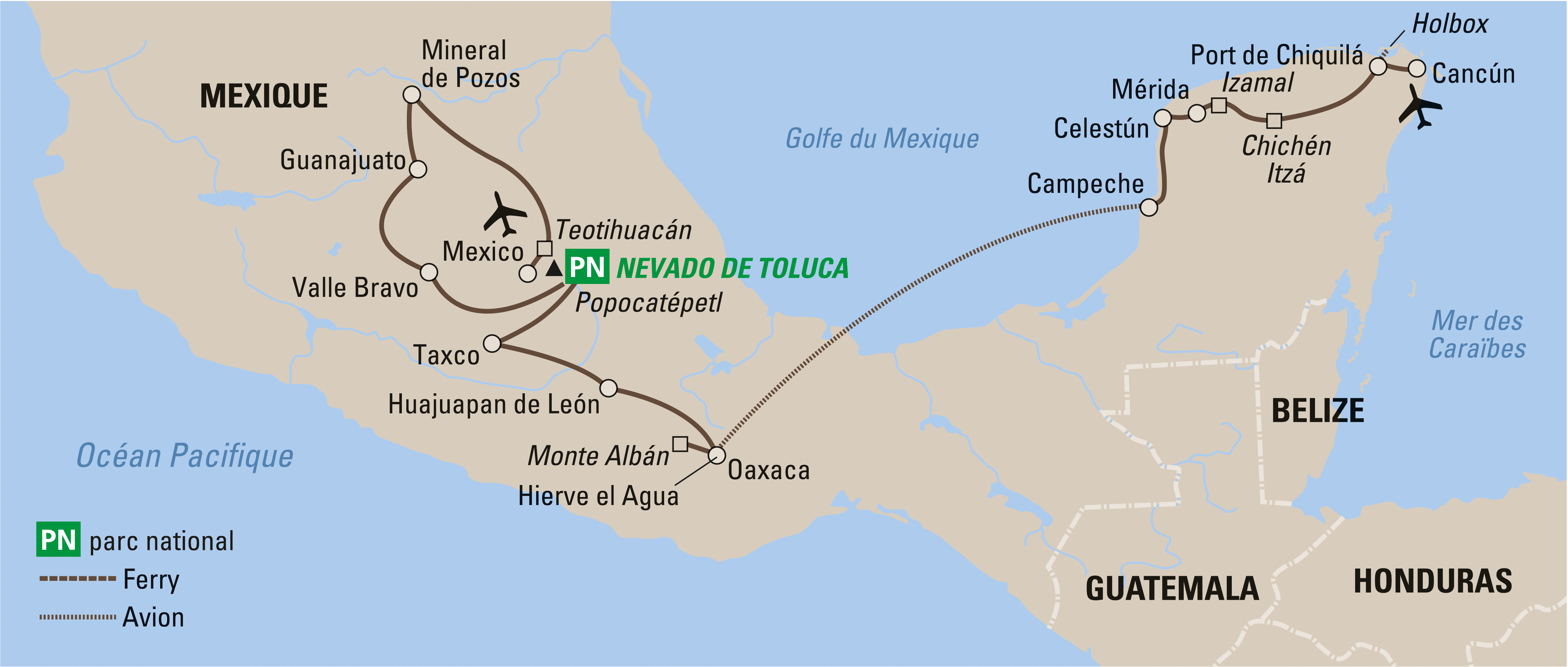 Ce circuit exceptionnel nous emmène à la découverte des mondes fascinants des Mayas, des Aztèques, des Toltèques et des Mixtèques, avec leurs pyramides impressionnantes et leurs temples mystérieux. Nous plongerons dans l'histoire, la culture et la vie moderne du Mexique et découvrirons la diversité de sa nature, de sa cuisine et de sa faune. Sur les traces des conquérants espagnols, nous explorerons de magnifiques villes coloniales, découvrirons des traditions indigènes vivantes et nous laisserons envoûter par un éventail complet de couleurs : plages de sable blanc, mer turquoise, forêts tropicales verdoyantes et volcans enneigés.
